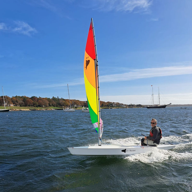 Hoisting the sail could not possibly be any easier thanks to the Rocket’s timeless tried-and true lateen sail setup. The sail, boom and gaffe lay down on the deck waiting for the halyard to be pulled. Pull the halyard 10 feet and cleat it. Congratulations! You’re done. Go sailing. Repeat these steps in reverse when you land. There is a good reason why the lateen sail has been uses on millions of production sailing dinghies since the 1950’s. Dollar for dollar, outing for outing, nothing gets the job done more easily.